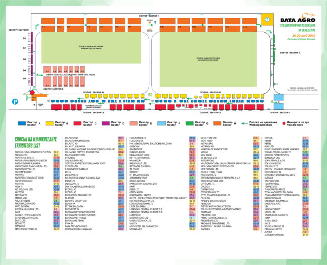 Картата с всички изложители и техните позиции за 14-тото Специализирано изложение за земеделие БАТА АГРО, както и полезна информация като работно време и достъп за посетители са налични тук. Свалете файла от линка на Вашето мобилно устройство и ще имате картата на изложението с Вас при посещение.